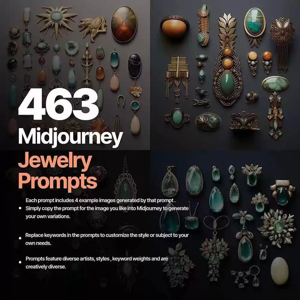 用463条专业的Midjourney提示,打造惊艳的珠宝设计,带来无限的创意可能性。